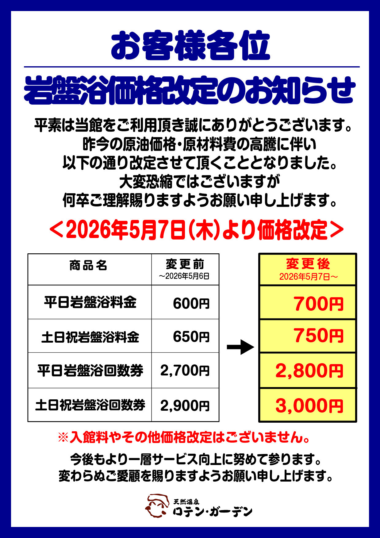 岩盤浴価格改定のお知らせ